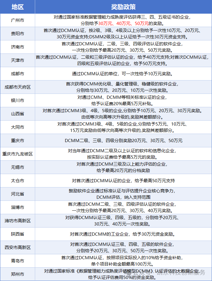 (1)直接獎(jiǎng)勵(lì):廣州對(duì)通過DCMM五級(jí)以上企業(yè)給予最高50萬元補(bǔ)貼