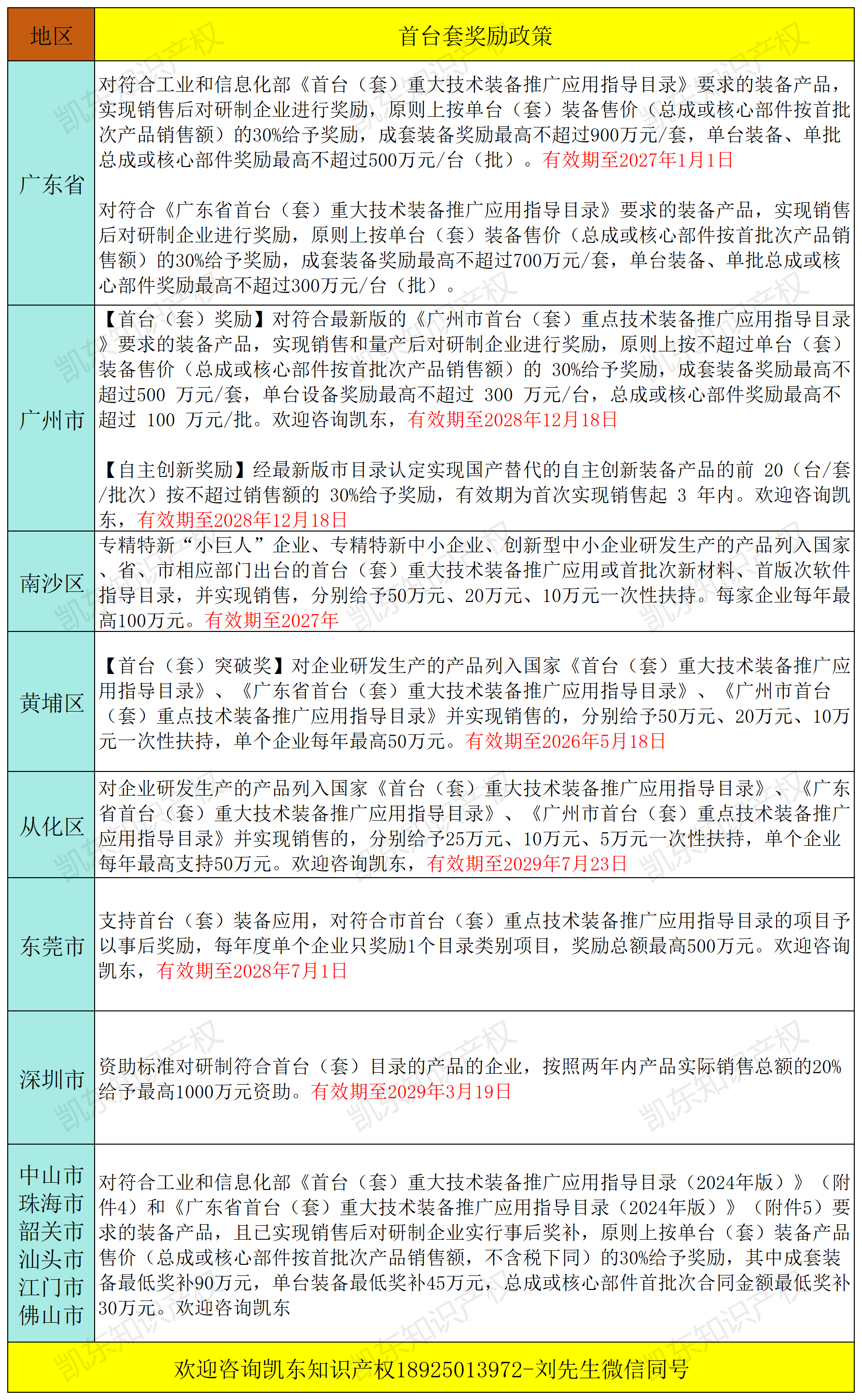小編精心整理了廣東省首臺(tái)套申報(bào)獎(jiǎng)勵(lì)政策匯總(見(jiàn)下圖),為已提交申請(qǐng)的企業(yè)以及計(jì)劃在2026年申報(bào)首臺(tái)套的企業(yè)提供參考。若圖片中未涵蓋相關(guān)地區(qū)的獎(jiǎng)勵(lì)政策,可向凱東知識(shí)產(chǎn)權(quán)咨詢(xún)了解。